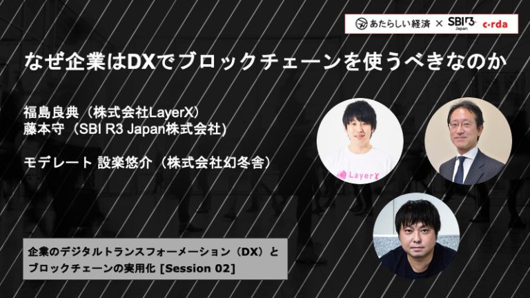 あたらしい経済とSBI R3 Japan 株式会社の共催オンラインイベント「企業のデジタルトランスフォーメーション(DX)とブロックチェーンの実用化」の第2セッション「なぜ企業はDXでブロックチェーンを使うべきなのか」の … 続きを読む なぜ企業はDXでブロックチェーンを使うべきなのか〜福島良典(株式会社LayerX) 藤本守(SBI R3 Japan株式会社)