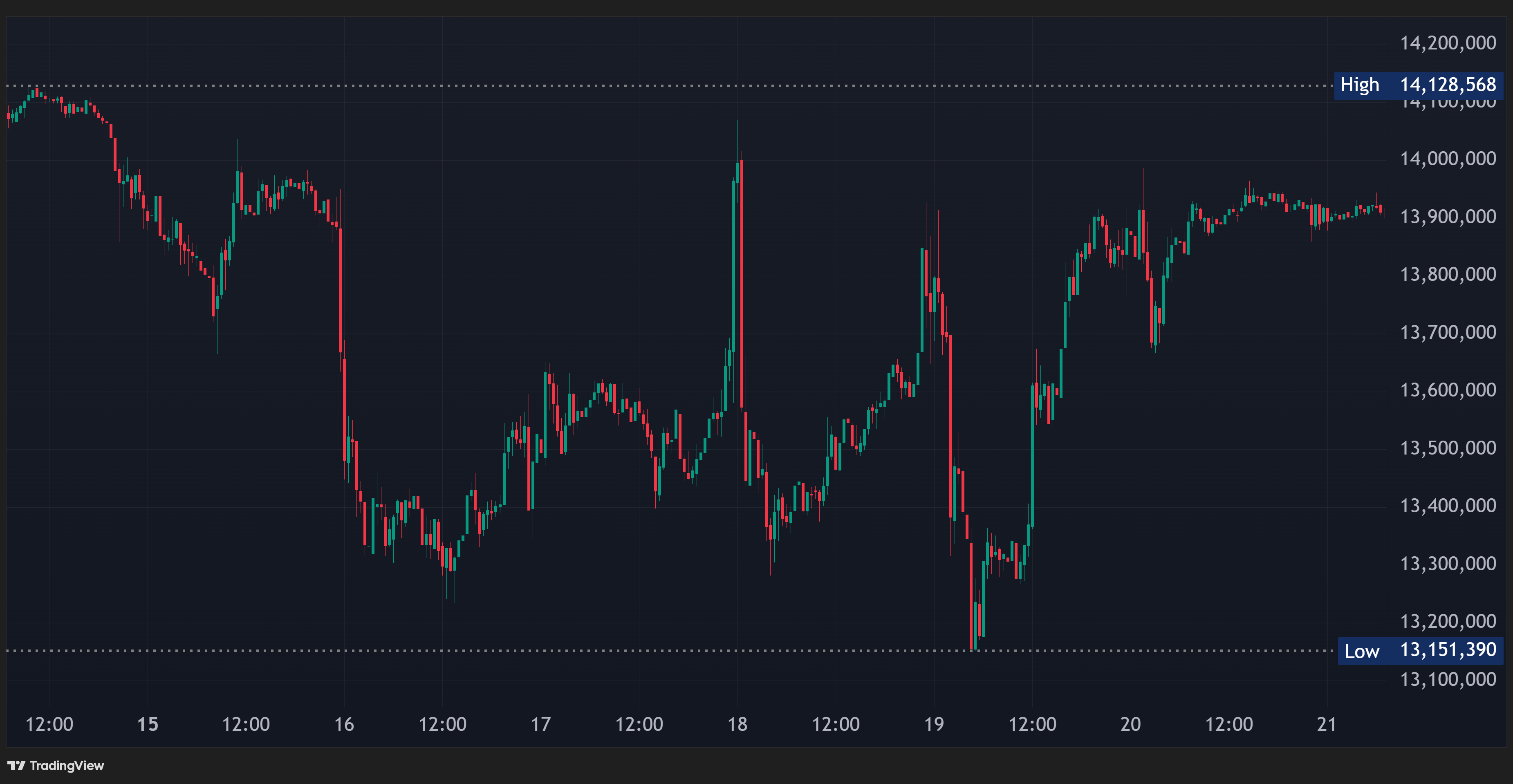 12/14~12/20週におけるBTC/JPYの週足終値は前週比▲1.14%の13,932,350円、ETH/JPYの週足終値は同▲3.26%の470,465円であった(※終値は12/20の当社現物EOD[12/21 6:59:59]レートMid値)。