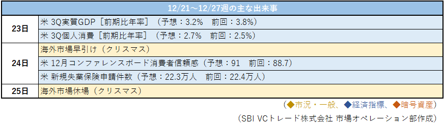 今週は24日(水)にクリスマスイブの早引け、25日(木)にクリスマスによる休場とクリスマスや年末休暇に入るため、市場参加者が減少し流動性が低い状態での取引となる可能性が高い。米国では第3四半期実質GDPや新規失業保険申請件数などの発表が予定されているが、低流動性による突発的な値動きには十分注意されたい。