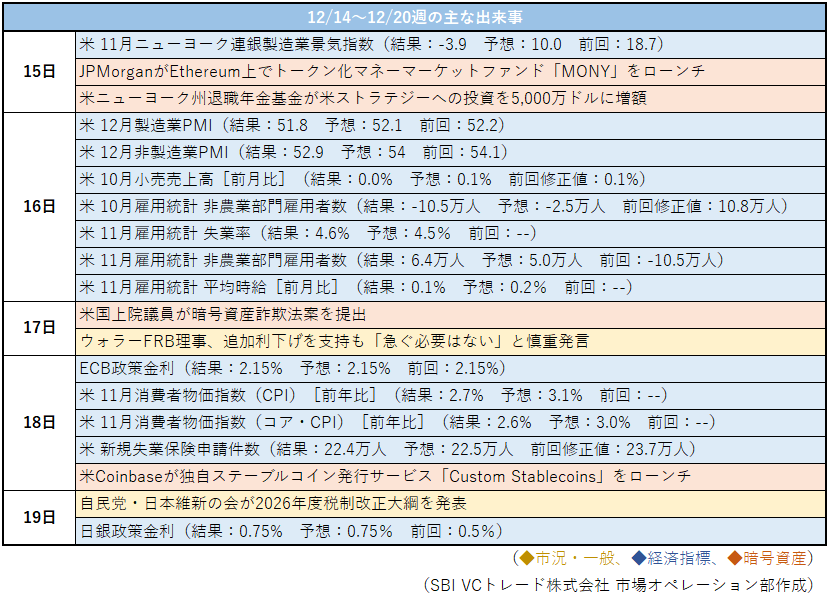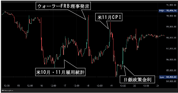 16日に予定通り米雇用統計が発表され、11月の非農業部門雇用者数は64,000人と市場予想を上回ったものの増加幅は小さく、10月の105,000人減少を完全には相殺できなかった。また失業率は市場予想を上回る4.6%と2021年9月以来の高水準となった。ただし今回の米雇用統計は、米国政府機関閉鎖という一時要因の影響を含む可能性が高く、労働市場の減速を示唆しつつも、FRBの政策判断に直結する材料としては慎重な解釈が求められる内容だった。このためビットコイン価格も発表直後は一時的に下落したもののすぐに反発し、その後も方向感のあるトレンド形成には至らず、反応は限定的となった。