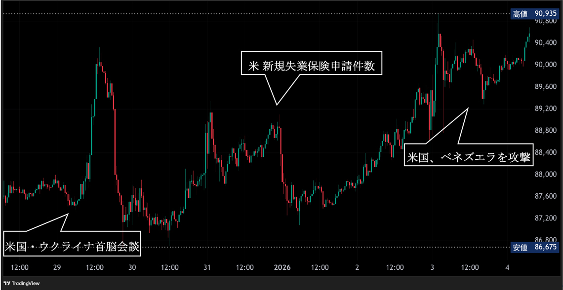 週末には、地政学的リスク要因として米国によるベネズエラ・カラカスへの軍事行動が報じられた。これを受けビットコインは一時的に小幅下落したものの、その後に実施されたトランプ米大統領の記者会見を含め、市場への影響は限定的にとどまった。