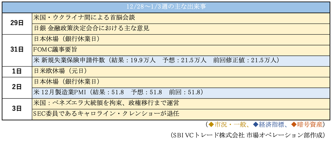 なお、米国・ウクライナ関係を巡る動きも報じられたが、年末の低流動性環境下ではリスク資産全体への波及は限定的にとどまった。