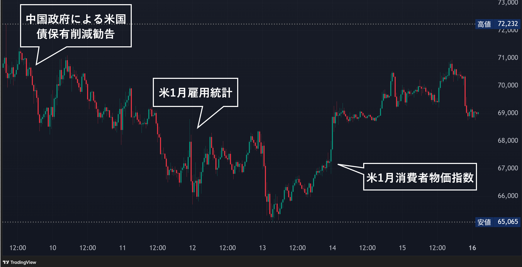 BTCの週初は70,000ドルの上値を試す展開から始まり、ブレイクアウトするとそのまま上昇し一時72,000ドルをつけた。しかし翌9日、中国政府が国内金融機関に対し米国債の保有削減を勧告したとの報道を受け、投資家心理が悪化。BTCは68,300ドル付近まで下落した。その夜、米国株式市場が開くと、先週下げていたハイテク株を中心に押し目買いが入り上昇。BTCも連れ高となり再び70,000ドルを突破したが、その後は徐々に下げる展開となった。