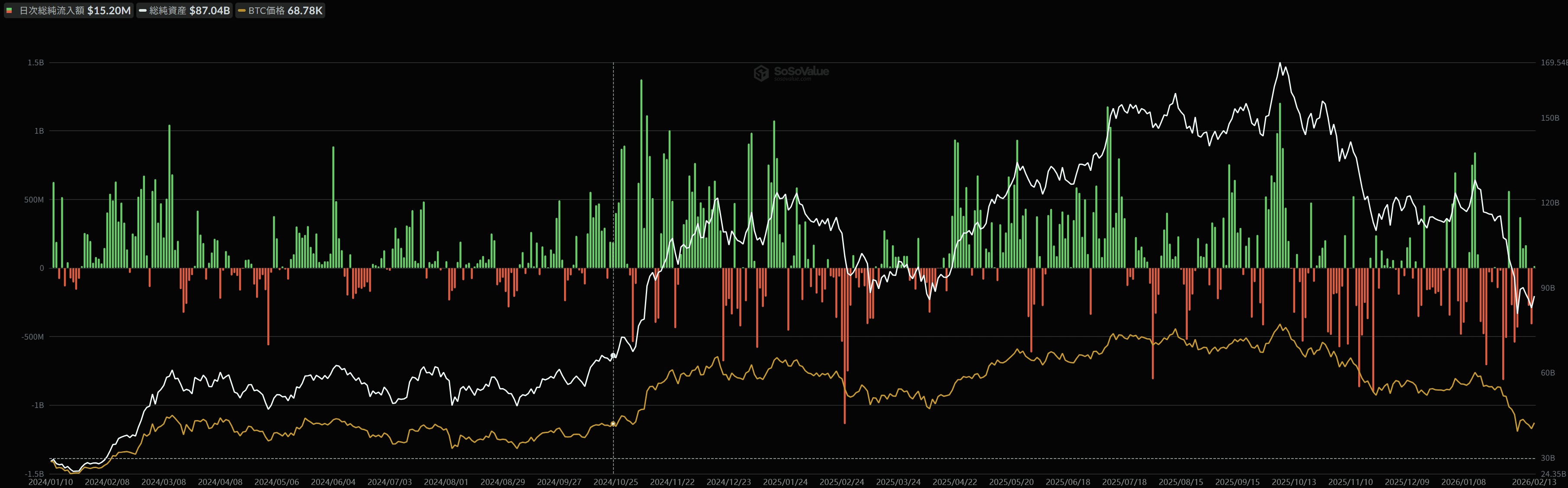 先週は好材料よりも悪材料に過敏に反応する展開が続き、投資家心理の悪化から下げやすい地合いが継続していた。実際にBTC現物ETFの売買動向を見ると先週は約3.6億ドルの売り越しとなっている。SoSoValueのデータによると、買われている日はあるものの、売り圧力のほうが強い傾向にあるといえるだろう。ただし、週末には再び70,000ドル付近まで回復するなど、局所的な底堅さも見られる。