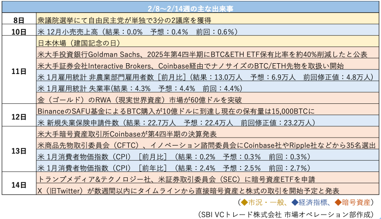 2/8~2/14週におけるBTC/JPYの週足終値は前週比▲2.17%の10,684,250円、ETH/JPYの週足終値は同▲3.45%の318,705円であった(※終値は2/14の当社現物EOD[2/15 6:59:59]レートMid値)。