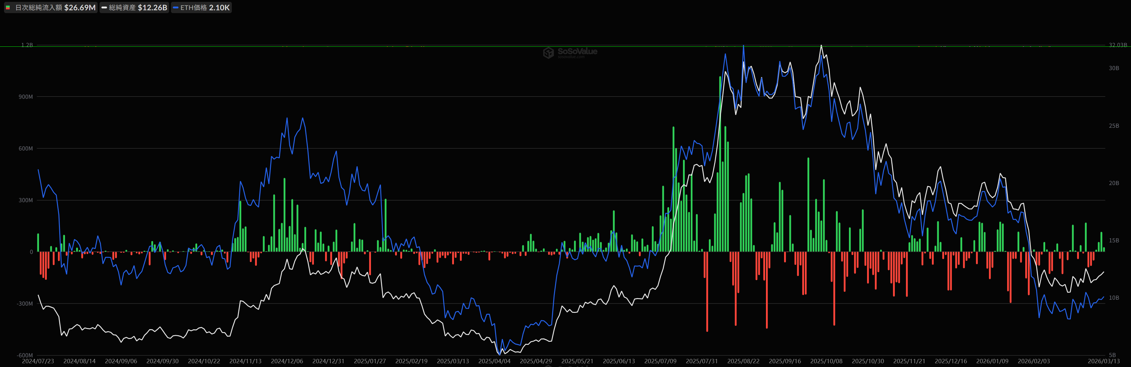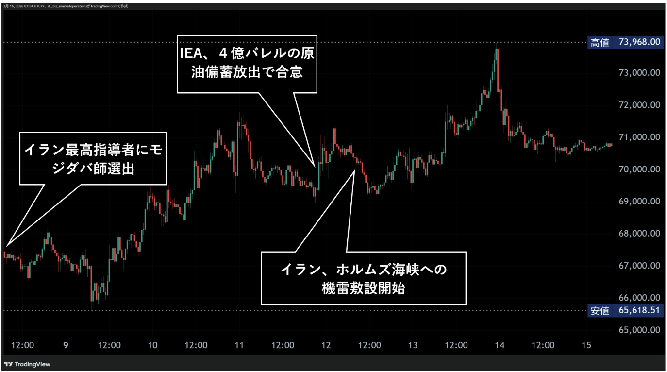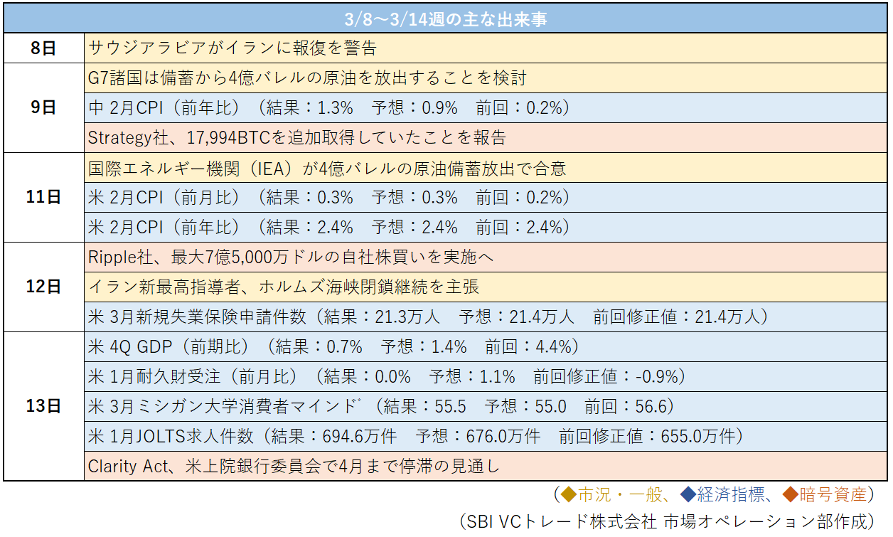 同日には、米上院のスーン氏が「クラリティ法案の4月までの通過は困難」との見方を示したものの、市場の関心は中東情勢に集中しており、暗号資産関連ニュースの影響はごく小さなものにとどまった。総じて、3月8日から14日の週は、主要ファンダメンタルズや暗号資産固有の材料よりも地政学リスクが価格形成の中心となり、報道のタイミングによって短期的な値動きが大きく左右される展開が続いた。