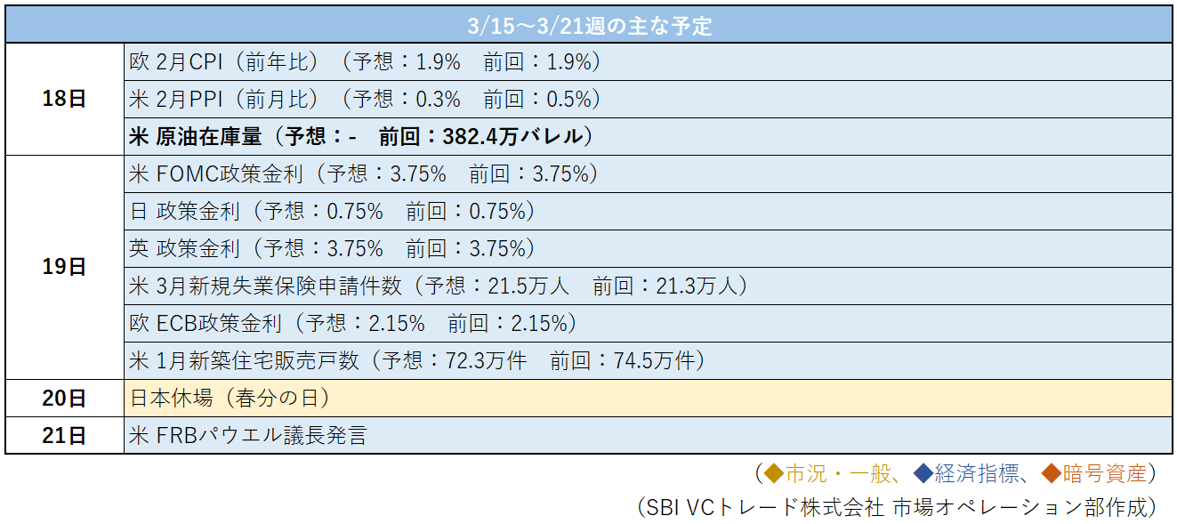 今週16日からの一週間では、18日に発表される米国の原油在庫量に加え、19日に開催されるFOMC政策金利発表、21日のFRBパウエル議長発言が主な注目材料である。市場はすでに中東情勢に強く反応しやすい地合いにあるが、米金融政策の方向性はリスク資産全体のセンチメントを揺さぶる可能性が高く、暗号資産市場にとっても無視できないイベントである。