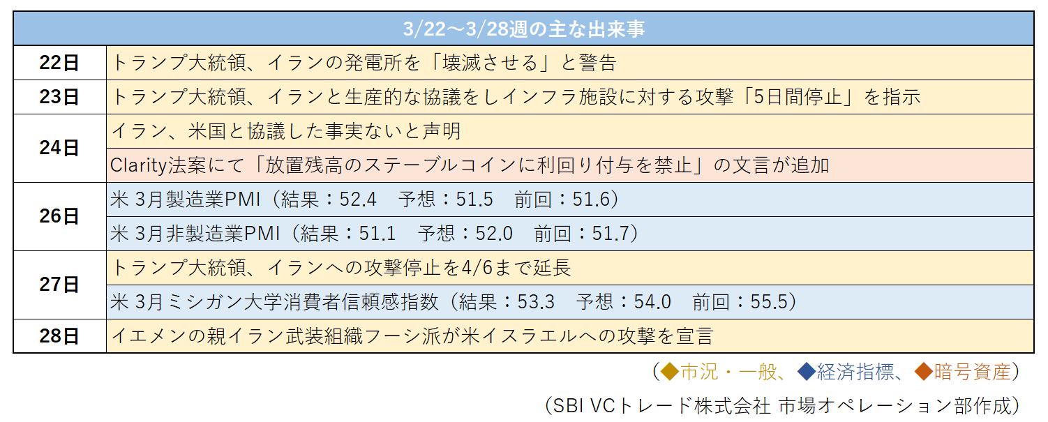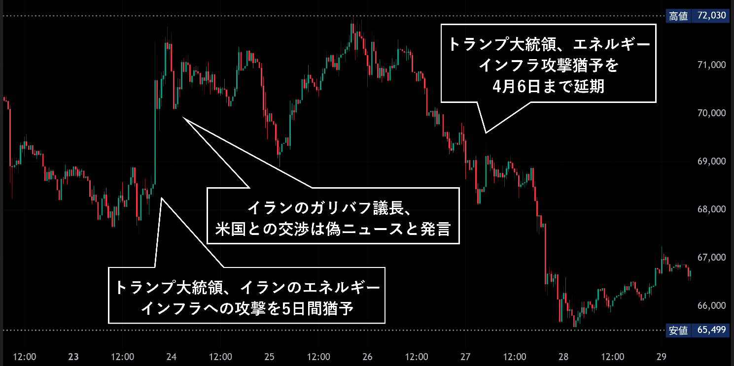 先週の暗号資産市場は、週初にかけて中東情勢の緩和期待を背景に反発したものの、その後は外交進展への懐疑、インフレ懸念の再燃を受けて上値の重い展開となった。トランプ大統領がイランのエネルギー関連施設への攻撃を5日間停止すると発表したことで、原油価格は急落し、ビットコインを含むリスク資産は一時持ち直した。しかしながら、米国側が協議進展を示唆する一方で、イランは交渉の事実を否定し、週半ば以降は緊張緩和期待の後退とともにリスク選好も剥落した。