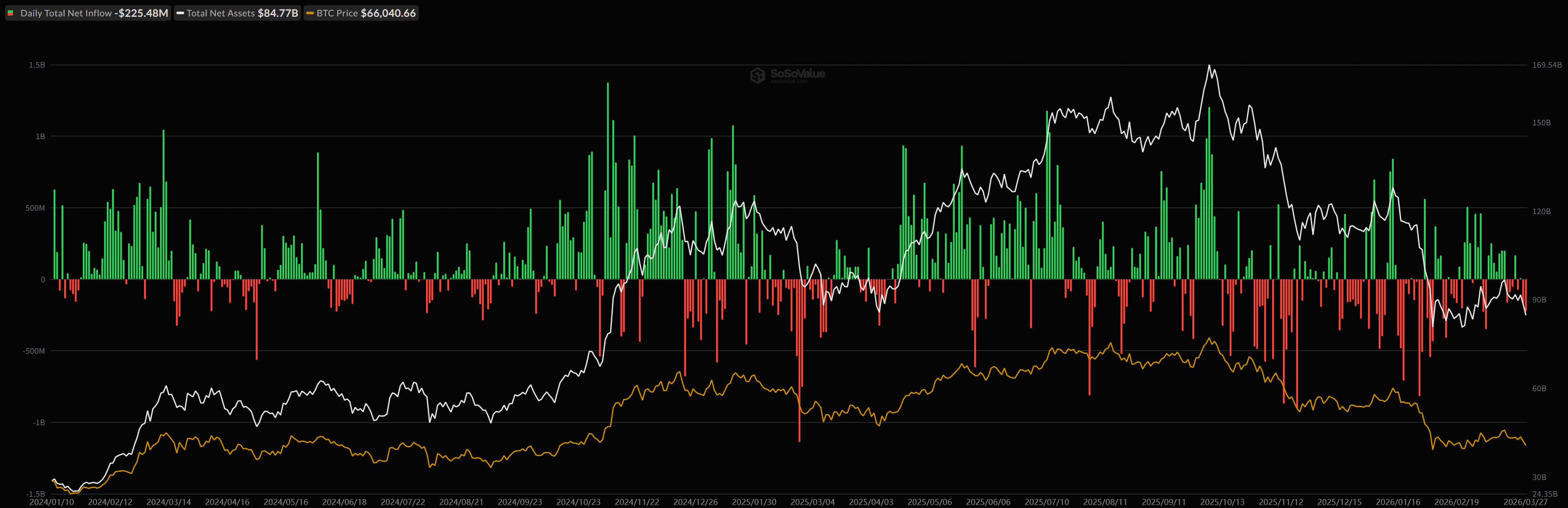 3)ビットコイン現物ETFの資金流入出と運用資産残高合計、ビットコイン価格
