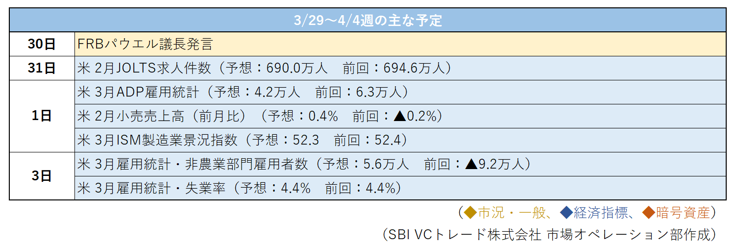 来週は米国3月雇用統計が注目経済指標となる。市場予想では非農業部門雇用者数が5.5万人~5.6万人程度の増加、失業率は4.4%と見込まれている。足元では中東情勢に伴う原油高がインフレ再燃懸念を高めており、雇用統計が予想を上回れば金利高・ドル高圧力が改めて意識されやすい。一方、停戦協議に進展が見られる場合には、直近のリスクオフの巻き戻し余地も残る。したがって、来週も暗号資産市場は固有材料よりも、中東情勢、原油価格、雇用統計、米長期金利といったマクロ要因に敏感な展開が続くものと考えられ、引き続き関連ヘッドラインのアップデートを注視したい。