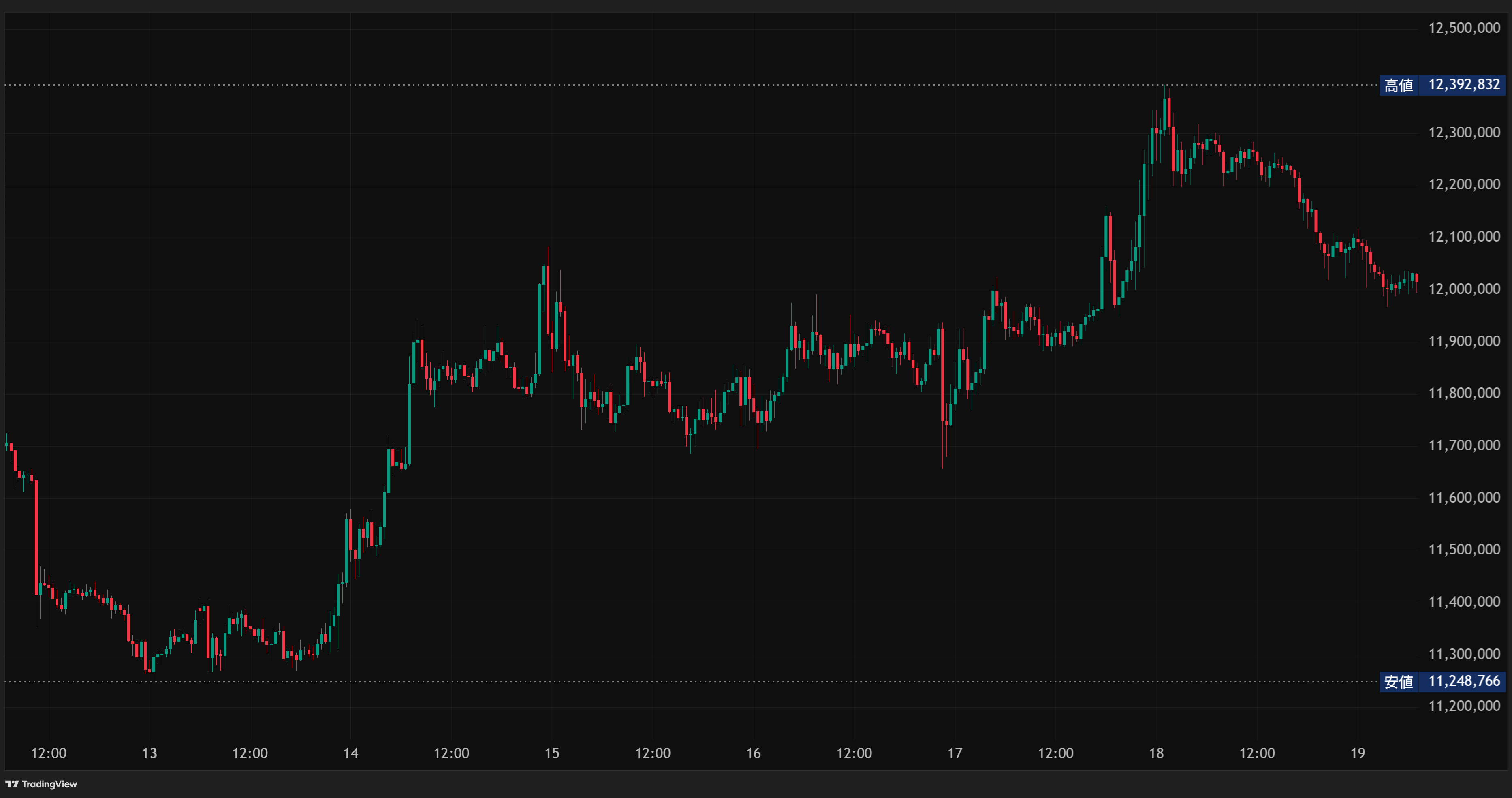 4/12~4/18週におけるBTC/JPYの週足終値は前週比+2.80%の12,040,050円、ETH/JPYの週足終値は同+ 2.00%の374,030円であった(※終値は4/18の当社現物EOD[4/19 6:59:59]レートMid値)。