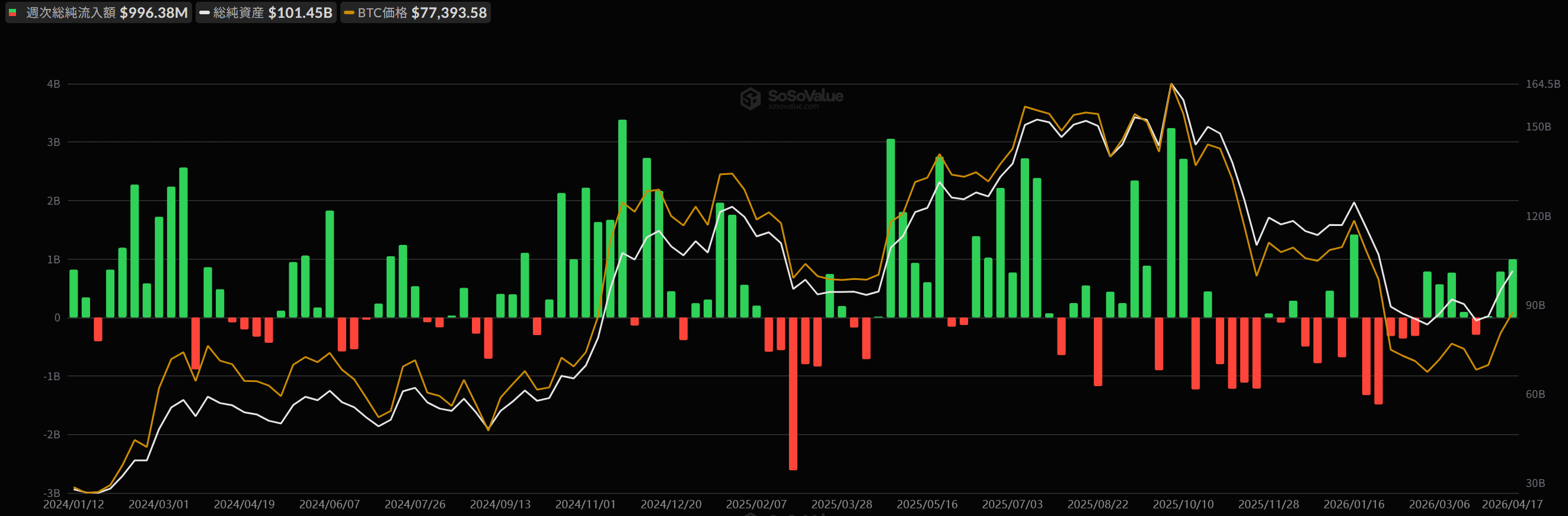 3)米BTC現物 ETF の資金流入出と運用資産残高合計(週足)、BTC価格