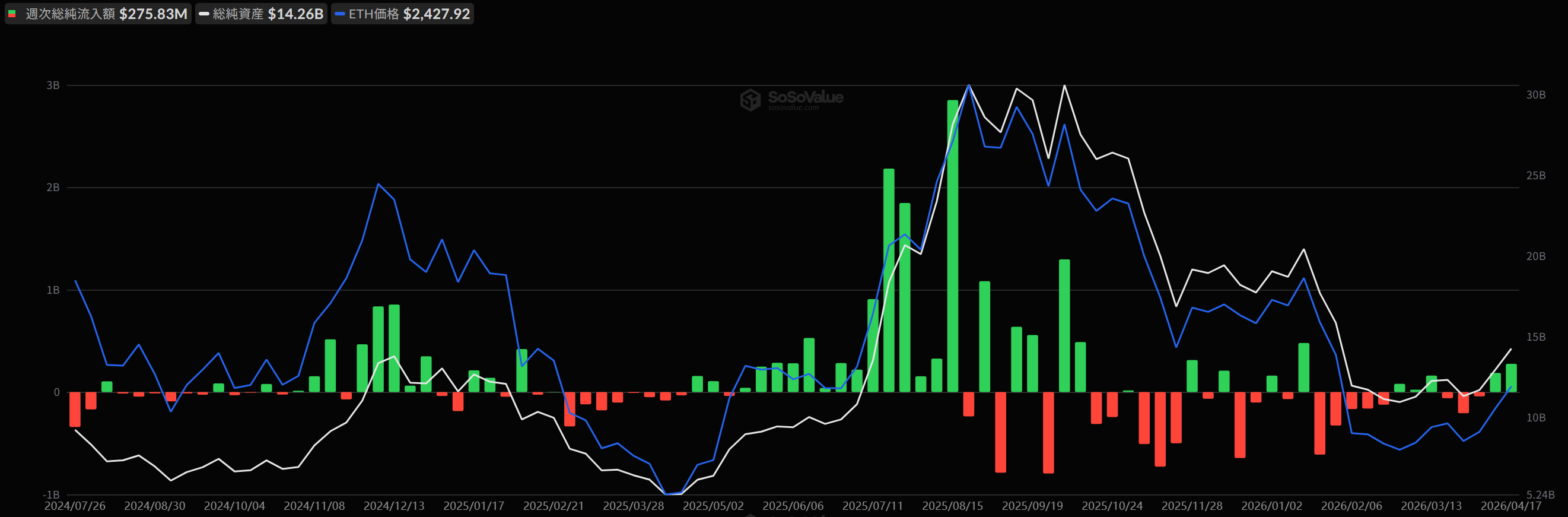 4)米ETH現物 ETF の資金流入出と運用資産残高合計(週足)、ETH価格
