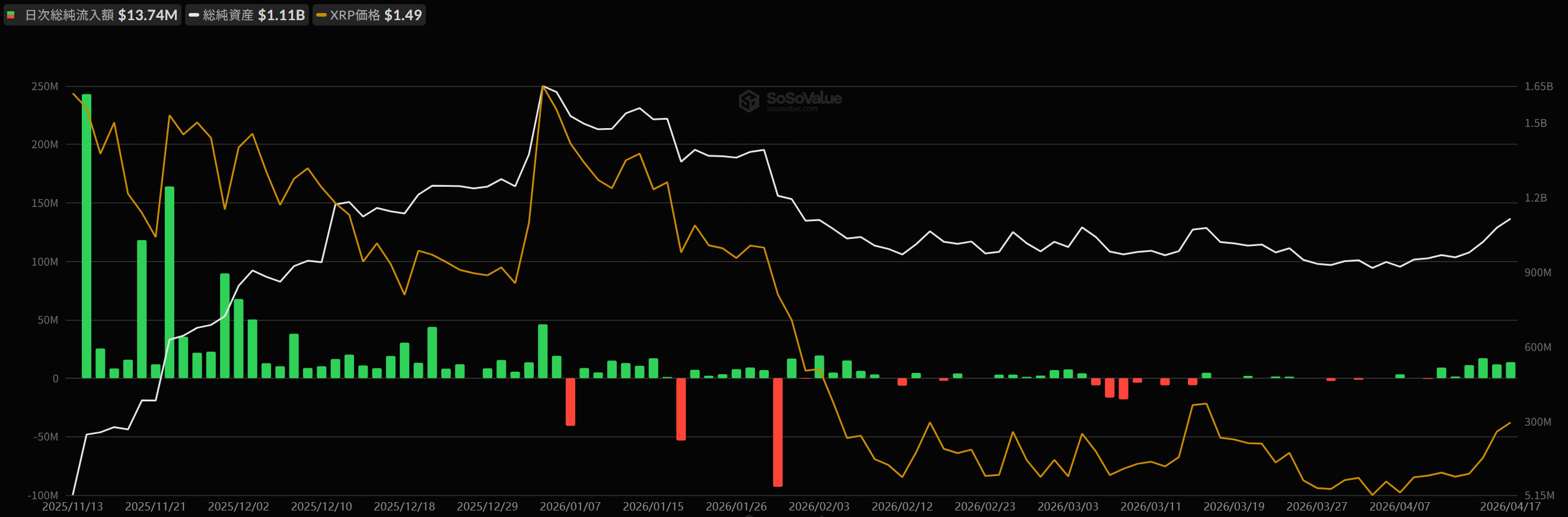 5)米XRP現物 ETF の資金流入出と運用資産残高合計(日足)、XRP価格