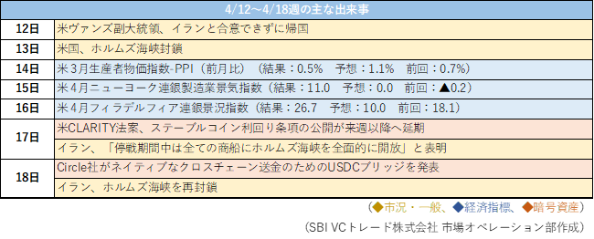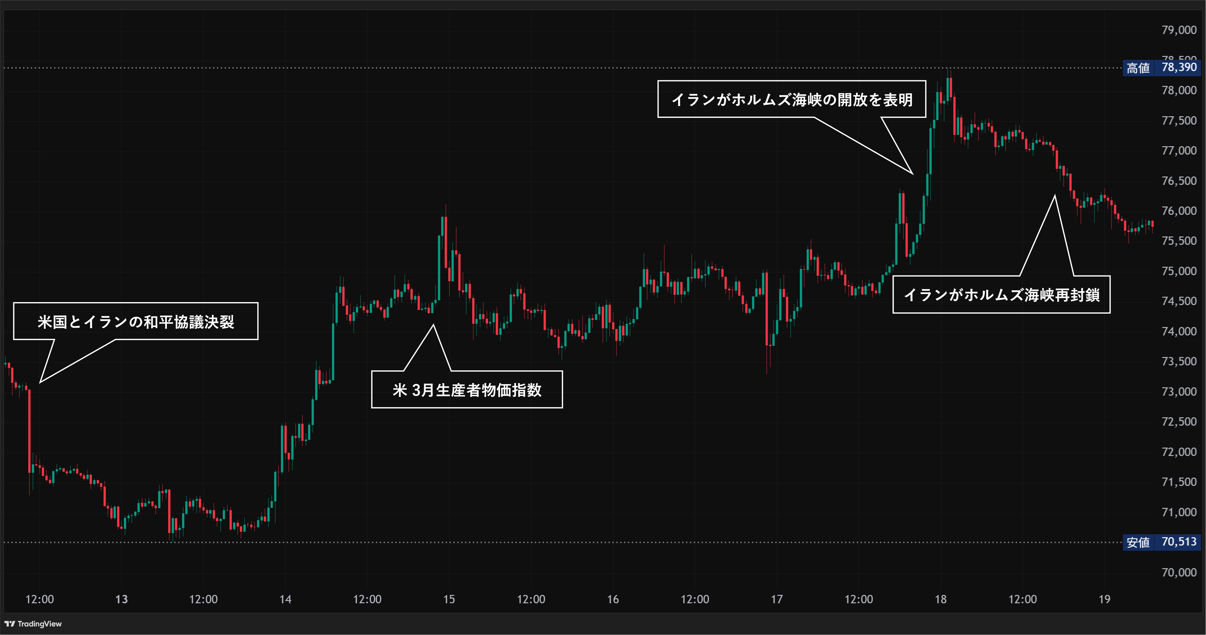 その後13日には、米軍による封鎖開始の動きが伝わる一方で、イラン側がウラン濃縮放棄を含む譲歩案を検討しているとの報道や、2回目の停戦協議の可能性が浮上したことから、交渉継続への期待が高まり、投資家心理は改善。リスク選好の回復を背景にビットコインには断続的に買いが入り、週初の下落前の水準を回復した。さらに14日にかけては、イラン情勢に対する楽観的な見方が広がったことで、株式などリスク資産が上昇、原油価格は下落。加えて、同日発表の米生産者物価指数(PPI)が市場予想を下回り、インフレ懸念が一時的に緩和したことも相場の支援材料となり、ビットコインは一時76,000ドル台まで上昇した。