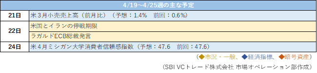 今週は、22日(日本時間)に設定されている米国とイランの停戦期限が焦点となる中、21日に2回目の和平協議が開催される可能性がある。トランプ大統領は19日のインタビューで、ウィトコフ大統領特使およびクシュナー氏が米東部時間20日夜にパキスタン入りし、翌21日の協議に臨む見通しを示した(ヴァンス副大統領は安全上の理由から不参加)。もっとも、本稿執筆時点でイラン側の正式な参加は確認されていない。また、直近では「トランプ発言をイラン側が否定」「開放宣言後も実態として封鎖が継続」など、公式発表と現実の乖離が散見されている。こうした状況を踏まえると、本局面では速報やSNSベースの情報に過度に依存したポジション変更には引き続き注意が必要だ。