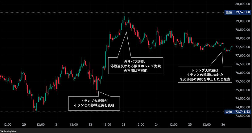 22日にトランプ大統領が「協議が終結するまで停戦を延長する」とコメントすると軍事行動の再開懸念は後退しBTCは上昇に転じ、イランが「米国がホルムズ海峡の封鎖を解除する兆候を受けとった」と報道し、トランプ大統領が「イランとの協議は早ければ金曜日にも可能」との発言が伝わると、約2か月半ぶりの80,000ドル台目前の79,500ドル付近まで上昇した。