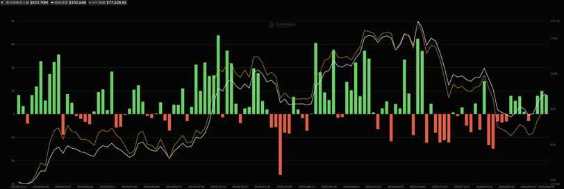 (緑・赤のバーが資金流入出 / 白線が運用資産残高合計/ 橙線がBTC価格)SoSoValue提供のチャートより SBI VC トレード株式会社 市場オペレーション部作成
