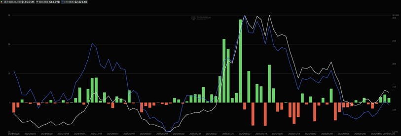 (緑・赤のバーが資金流入出 / 白線が運用資産残高合計/ 青線がETH価格)SoSoValue提供のチャートより SBI VC トレード株式会社 市場オペレーション部作成