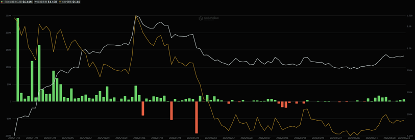 (緑・赤のバーが資金流入出 / 白線が運用資産残高合計/ 橙線がXRP価格)SoSoValue提供のチャートより SBI VC トレード株式会社 市場オペレーション部作成