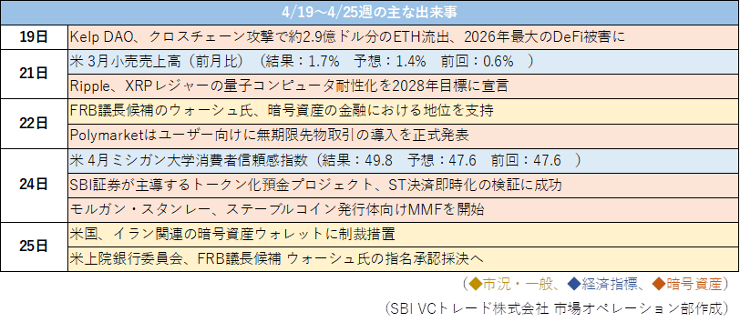 週初19日、トランプ大統領が「イランとの和平交渉にあたる代表団がパキスタンに入る」と表明し、BTCは75,000ドルから76,000ドルまで上昇する。しかし日付が変わったころ、イランが米国との2回目の協議の参加を見送ったと報道されると急落し、一時的に74,000ドルを割り込む展開となった。その後、イランのペゼシュキアン大統領が「戦争は誰の利益にもならない。緊張緩和のためにあらゆる合理的かつ外交的な手段を用いるべきだ」と述べると再び上昇し76,500ドル付近まで回復する。米国もイランも代表団をパキスタンに派遣する予定で協議再開に向けて期待感が高まっていた。