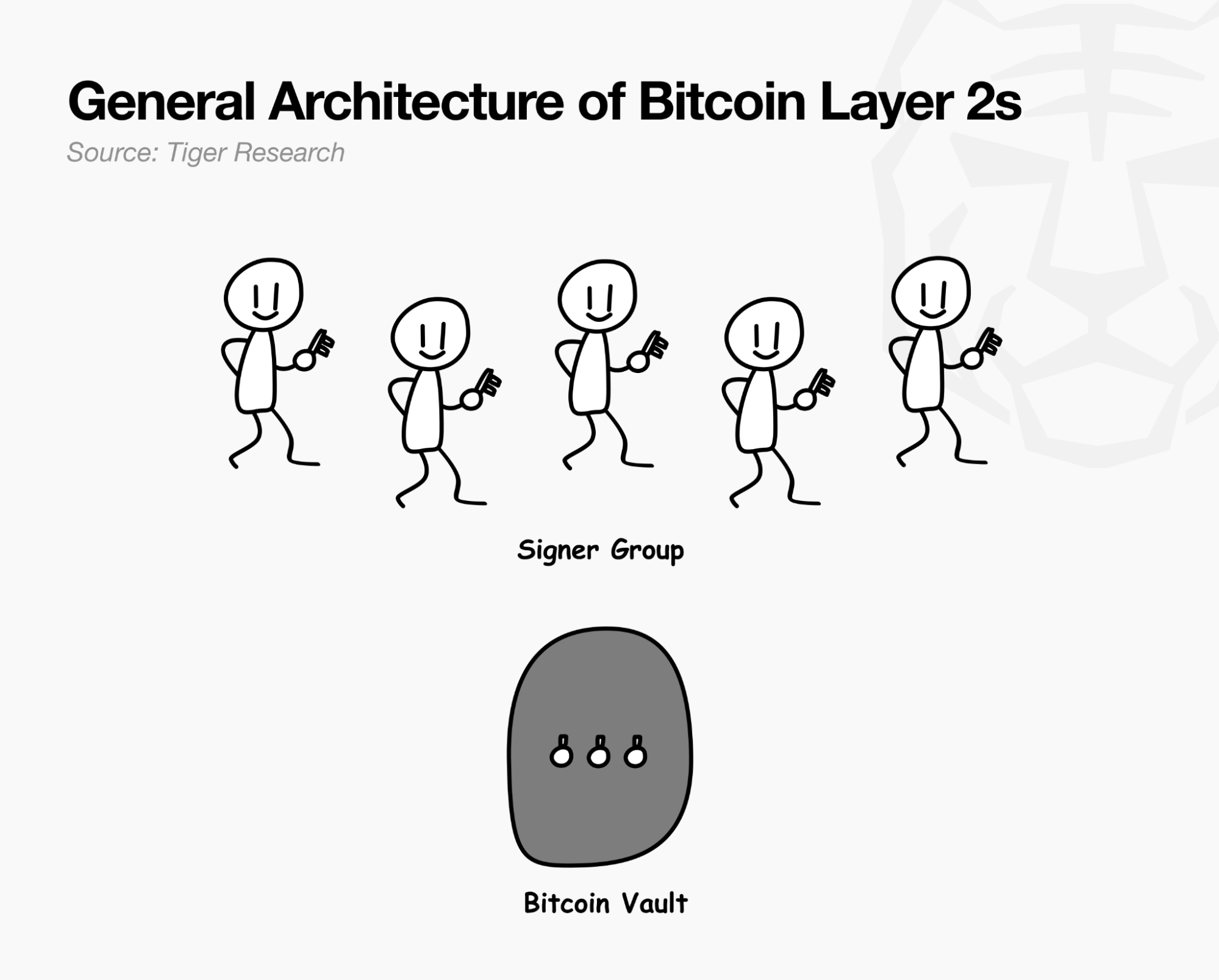 ほとんどのビットコインL2はこの構造から大きく離れていない。設計の詳細は異なるが、設計の詳細は異なっても、少数の署名者グループへの依存は一貫している。