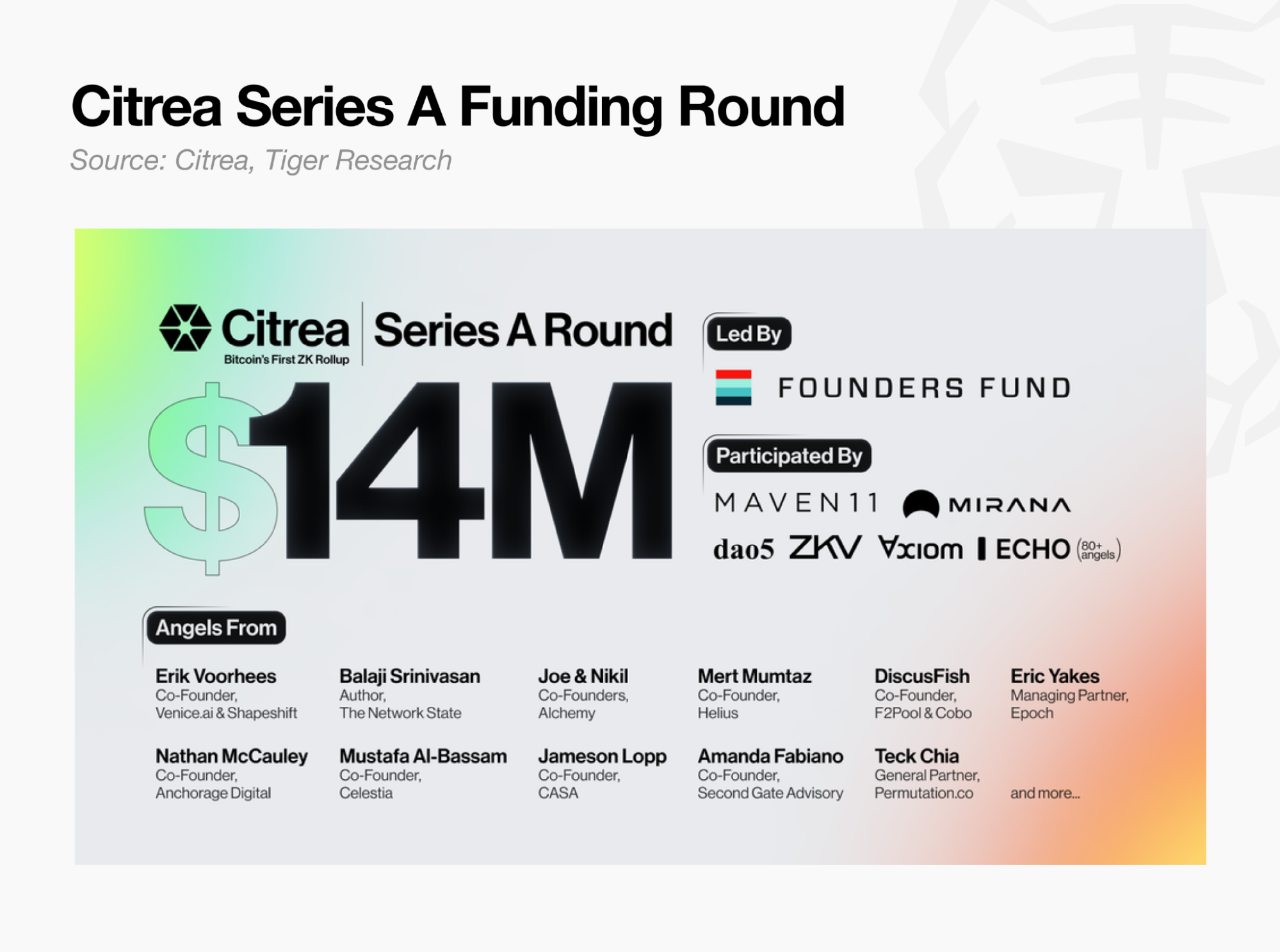 こうした背景の中で、ピーター・ティール(Peter Thiel)氏のFounders Fundはビットコイン上に初のZKロールアップを構築できるチームを選び、Citreaに出資した。単なるマーケティングの文句ではなく、ビットコインL2の技術的フロンティアへの高い確信に基づく賭けだ。市場全体が最も懐疑的になった時期に、その確信を行動に移した。