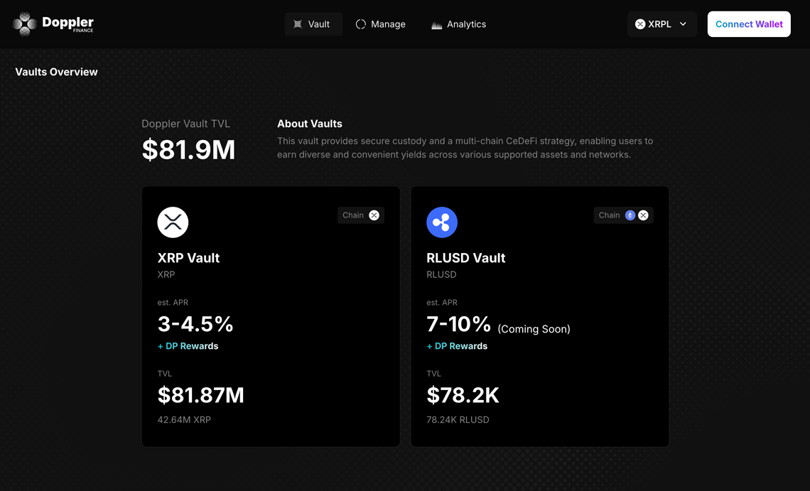 ドップラー・ファイナンスの公式サイトによると、XRPLの特性上、これまでXRP保有者には利回りを得る手段が限られており、多くのXRPが中央集権型取引所(CEX)上で未活用のまま滞留してきたという。同社はこうした課題に対し、XRPを預け入れることで利回りを得られる仕組みの構築を進めている。